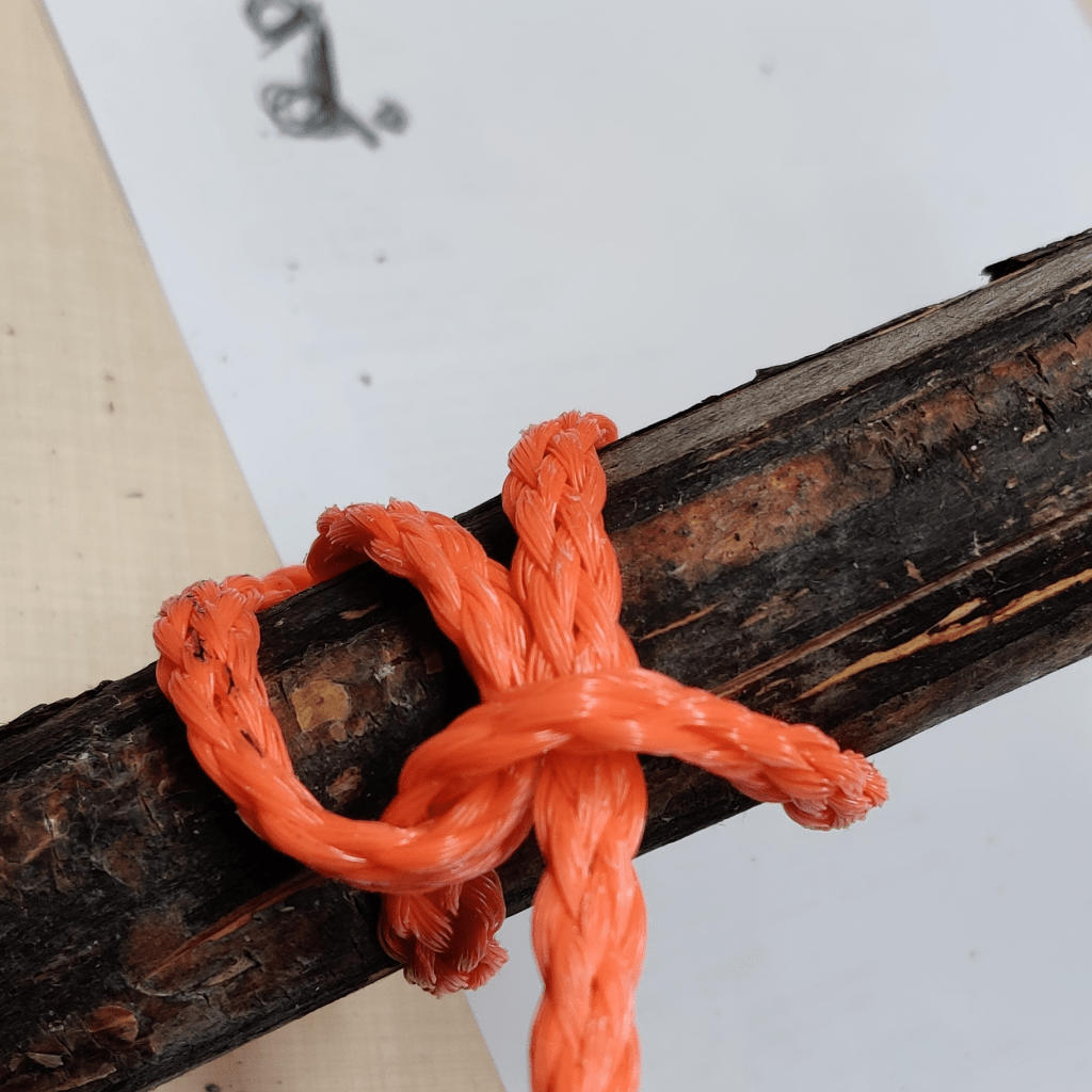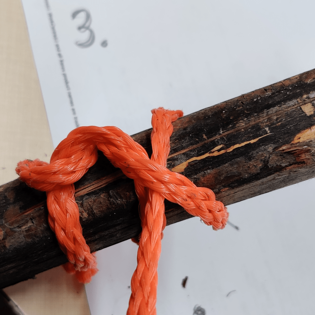 Silmukka (kuva 4) mahdollisimman lähelle ruodetta. Jokainen solmu jatkuu samalla tavalla kolmanteen riukuun asti. Solmut kannattaa lukita ruuveilla, jotta ne eivät valu alaspäin pystytettäessä. Kolmijalan nostamisen jälkeen kierrä ruoteita niin, että ne ovat kiinni toisissaan. Jos alin ruode jää roikkumaan, vaihda ruoteiden järjestystä.