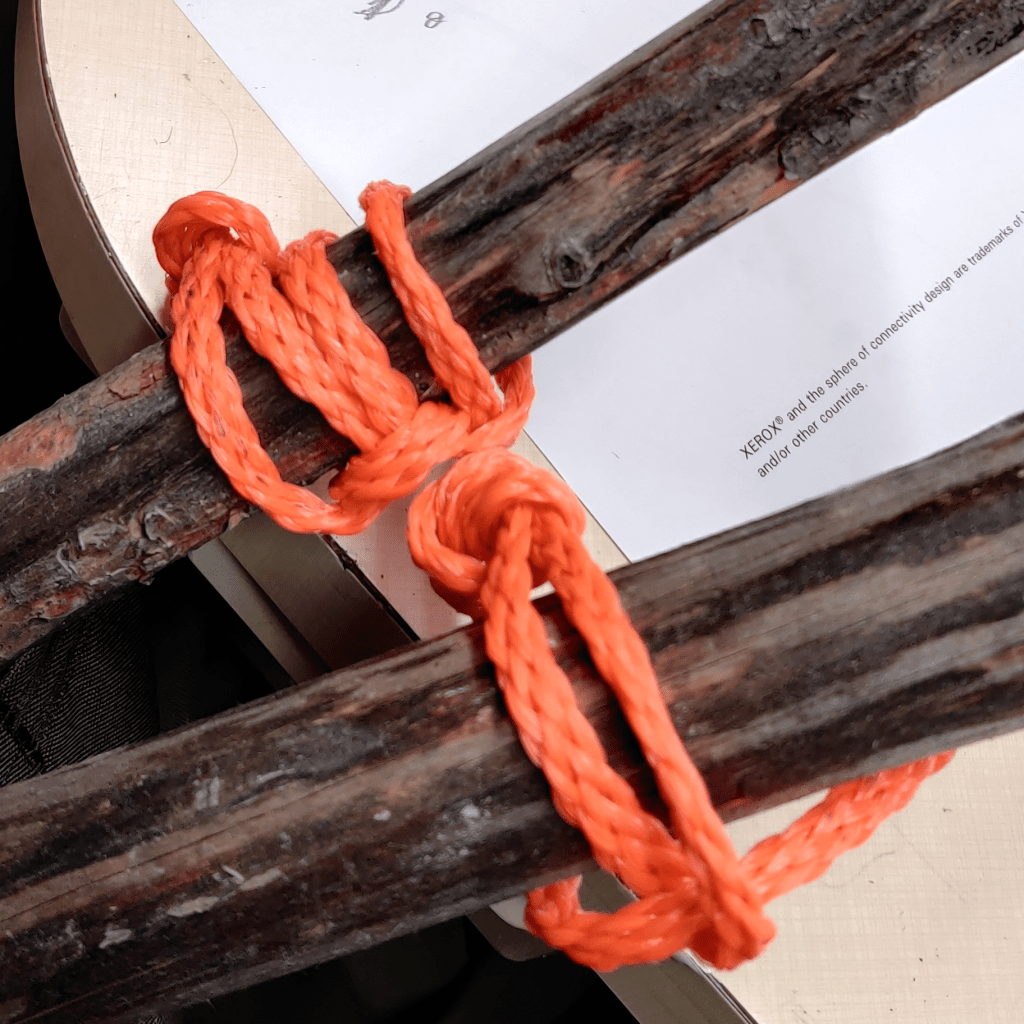 Jos kolmijalan sidoksessa on löysyyttä, ruoteita kierretään narun kiristämiseksi. Muovinarusta tehdyn solmun voi varmistaa ruuvilla.